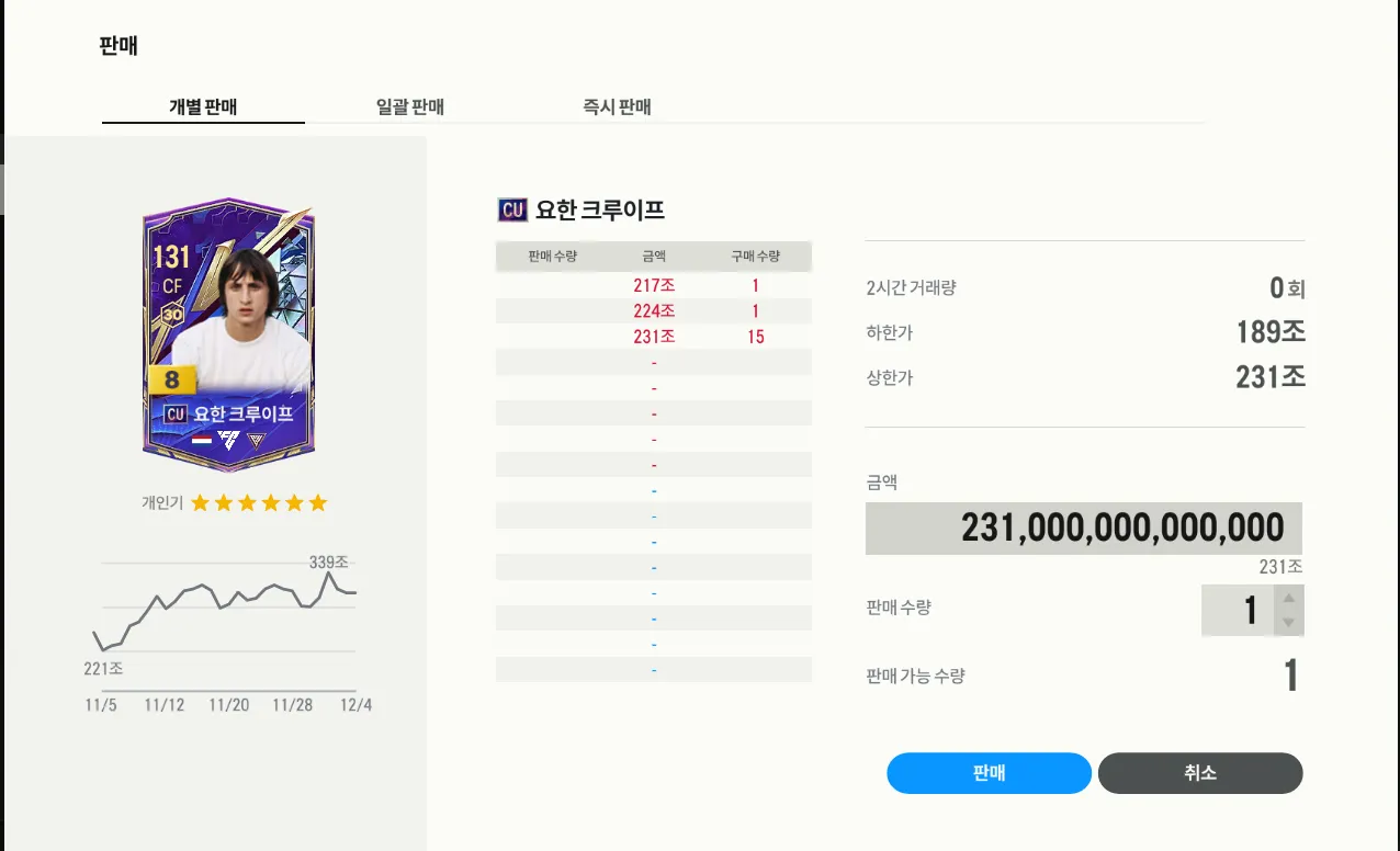 크루이프 팔아야하는데 갑자기 280조로 떨어지더니 빨간불 계속 떠있고 아무도 안파니까 자꾸 떨어짐 진짜 정신 나갈거 같은데 이러면 시세 언제 정상화 되나요..?
